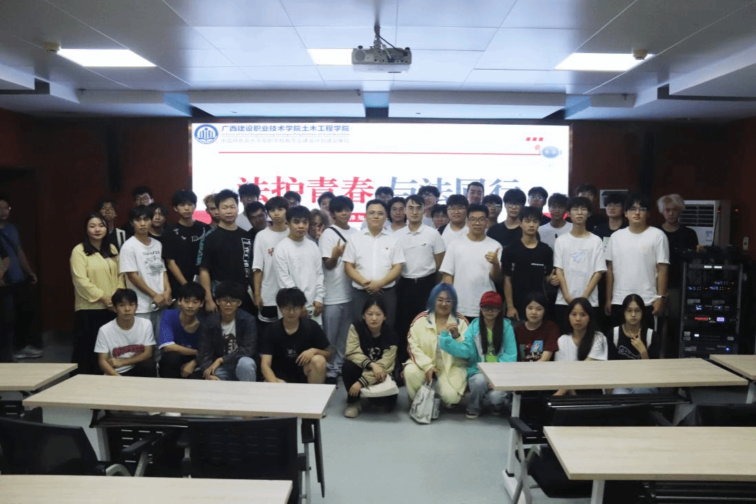 广西建院11月6日讯(土木工程学院  文/石明成  图/张伟  赵子丞)为加强学生法治素养与法治意识,11月1日,土木工程学院在5教906会议室开展了大学生法律知识普及与风险防范主题讲座,特邀广西华司律师事务所谭富松律师为主讲嘉宾,共110名学生参加本次讲座讲座由郑敏琦老师主持。