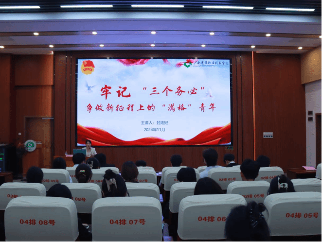 开班仪式结束后,学院团总支书记封炫妃以《牢记“三个务必”,争做新征程上的“满格”青年》为题,为“青马班”全体学员作开班第一讲。封老师以学、思、践、悟党的二十大报告中提到的“三个务必”为指引,带领同学们进行课程学习。
