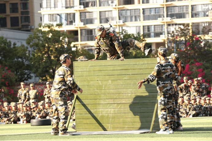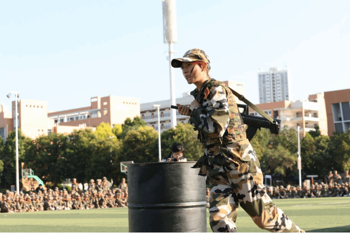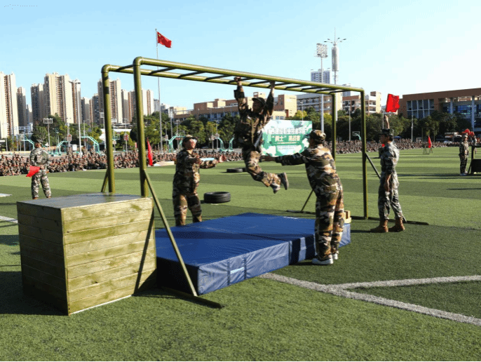 本次挑战赛,共7支参赛队,每队3人(2男1女),共有21名“勇士”进入到最后的角逐,竞赛项目除了根据学生军训科目设置外,还增加了更具“军味”的项目,分别有高姿网匍匐前进、S形绕桶、过平衡木、穿越矮墙洞、云梯(男)、翻轮胎(女)、越高墙、过轮胎阵、手榴弹投准、折返冲刺等。参赛队员完成折返200米的障碍跑,团队总用时最短的队伍,获得“勇士挑战赛”冠军。