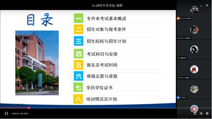 广西建院12月6日讯(市政与交通学院 林艳 朱海鹏)为推进2025年广西高等普通教育专升本考试工作,进一步做好专升本考试相关政策宣贯工作,市政与交通学院于11月28日晚通过视频会议形式召开了2025年专升本动员大会。该院领导班子、辅导员及2025届全体学生及部分家长参加。