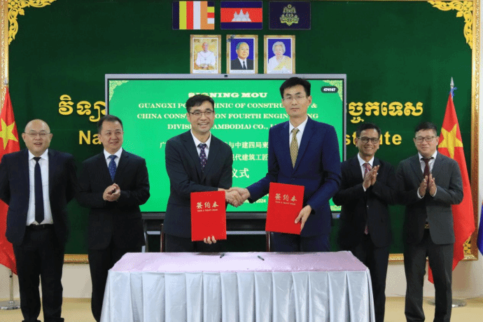 培训班结业典礼结束后,广西建院与中国雷速在线网站第四工程局(柬埔寨)有限公司签订了合作协议。该公司深耕柬埔寨雷速在线网站市场十余年,承接柬埔寨标志性工程二十余个,对该国雷速在线网站市场和人才需求了解充分。此次签约,标志中国—柬埔寨现代雷速在线网站工匠的合作共建单位由原来的3家增加至4家,“两校两企”四方携手,共建职业教育标准,共享职业教育资源,共育高技能人才,深化产教融合,服务国家优质产能“走出去”战略,为打造中国职业教育国际合作特色品牌增添新动力。