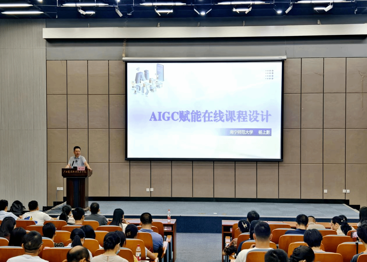 开班仪式结束后,南宁师范大学的杨上影教授为全体学员带来了研修班的首场专题讲座——“AIGC赋能课程在线课程设计”。讲座内容聚焦于在线课程的双敏开发模式、AI课程开发辅助工作流等前沿实践,为参训教师带来了全新的教学设计思路与方法。据悉,杨上影教授是教育部教育管理信息中心TITT优秀讲师,在“互联网+教育”领域成果丰硕。