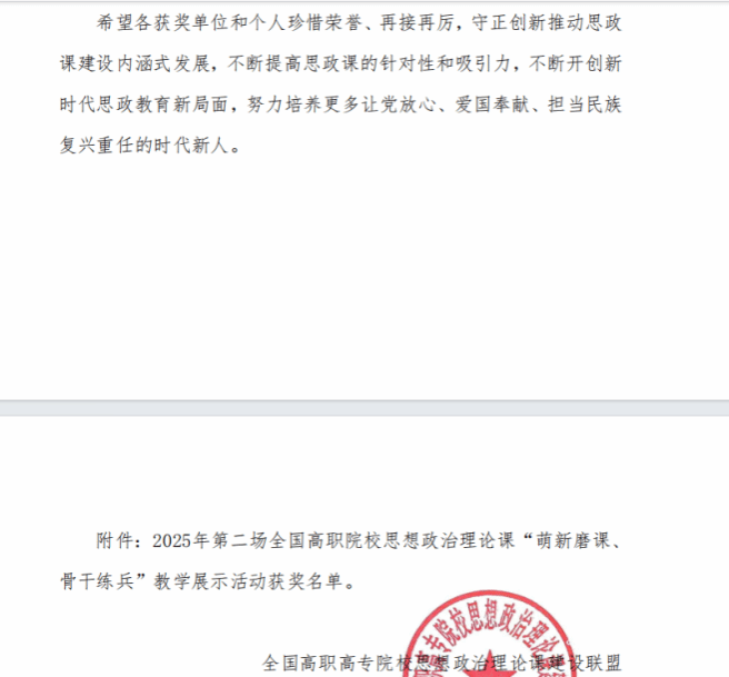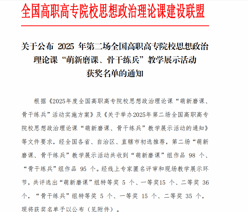 广西建院5月21日讯(马克思主义学院 潘柳虹)5月18日,全国高职高专院校思想政治理论课建设联盟公布了2025年第二场全国高职高专院校思想政治理论课“萌新磨课、骨干练兵”教学展示活动获奖名单。首页思政课教师苏亚莉荣获“骨干练兵”组二等奖。
