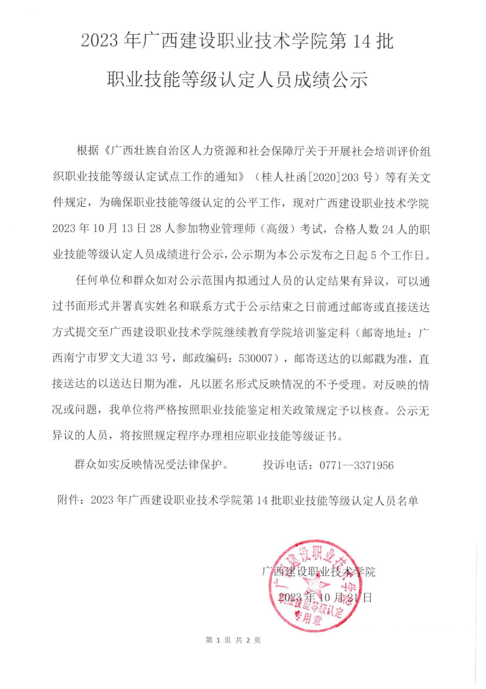 培训信息 当前位置: 首页 >> 培训信息 >> 正文 2023年雷速在线网站第14批职业技能等级认定人员成绩公示 发布日期:2023-10-27 点击: 附件【2023年雷速在线网站第14批职业技能等级认定人员成绩公示.pdf】已下载次