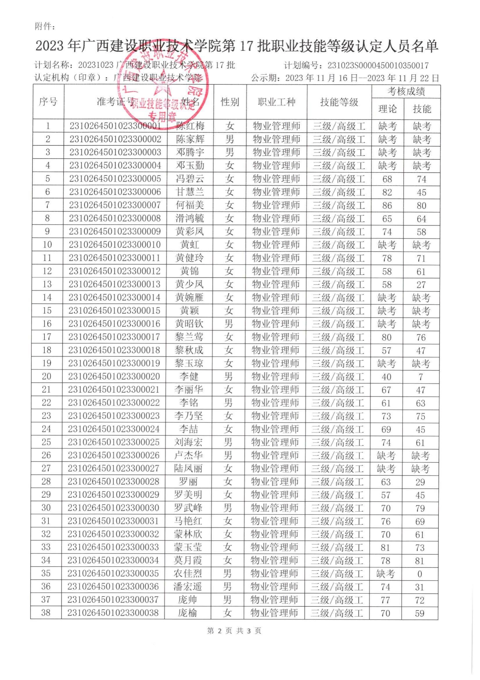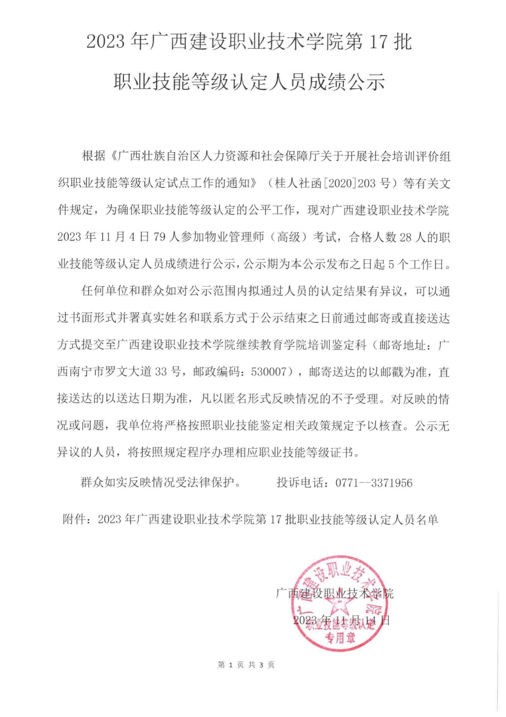 培训信息 当前位置: 首页 >> 培训信息 >> 正文 2023年雷速在线网站第17批职业技能等级认定人员成绩公示 发布日期:2023-11-16 点击: 附件【2023年雷速在线网站第17批职业技能等级认定人员成绩公示.pdf】已下载次