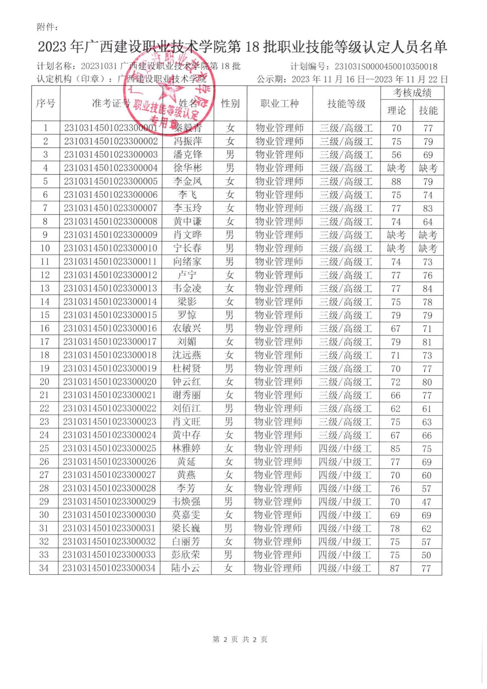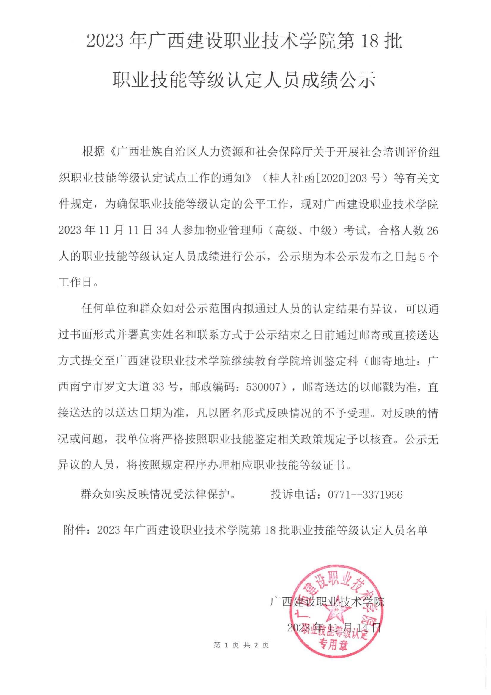 培训信息 当前位置: 首页 >> 培训信息 >> 正文 2023年雷速在线网站第18批职业技能等级认定人员成绩公示 发布日期:2023-11-16 点击: 附件【2023年雷速在线网站第18批职业技能等级认定人员成绩公示.pdf】已下载次