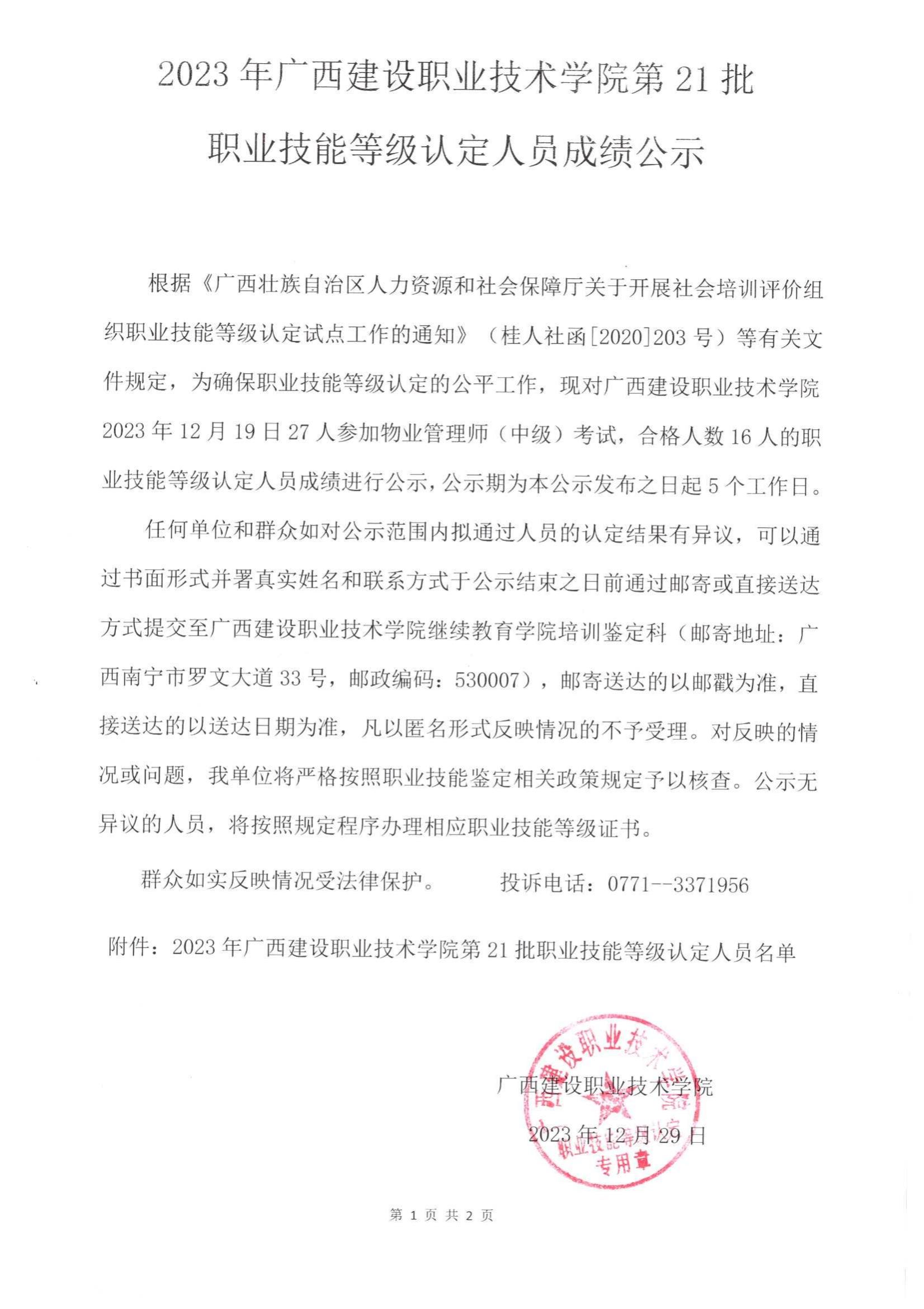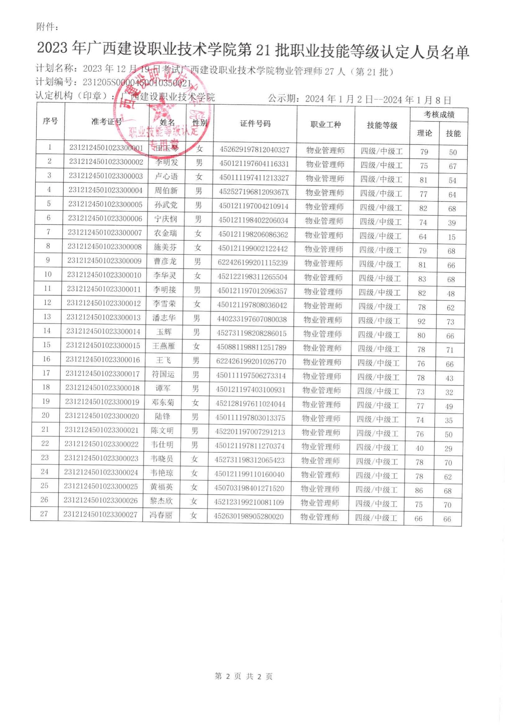 培训信息 当前位置: 首页 >> 培训信息 >> 正文 2023年雷速在线网站第21批职业技能等级认定人员成绩公示 发布日期:2024-01-02 点击: 附件【2023年雷速在线网站第21批职业技能等级认定人员成绩公示.pdf】已下载次