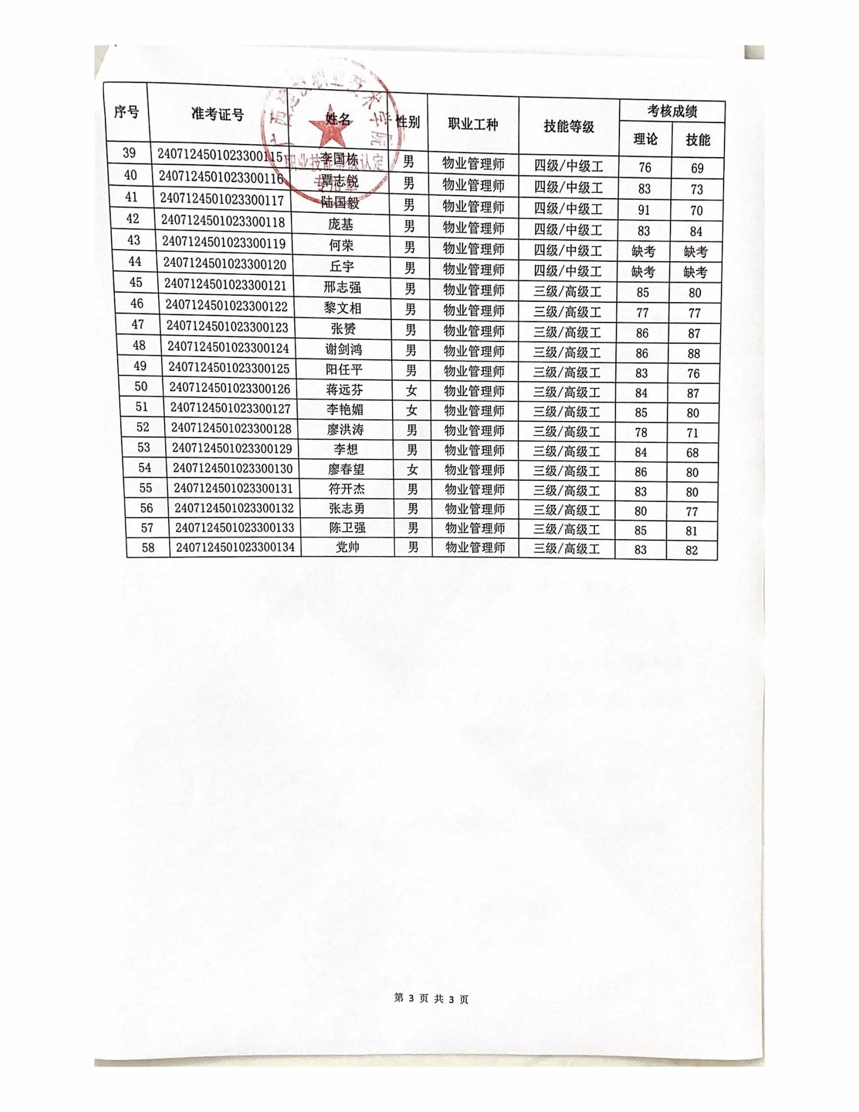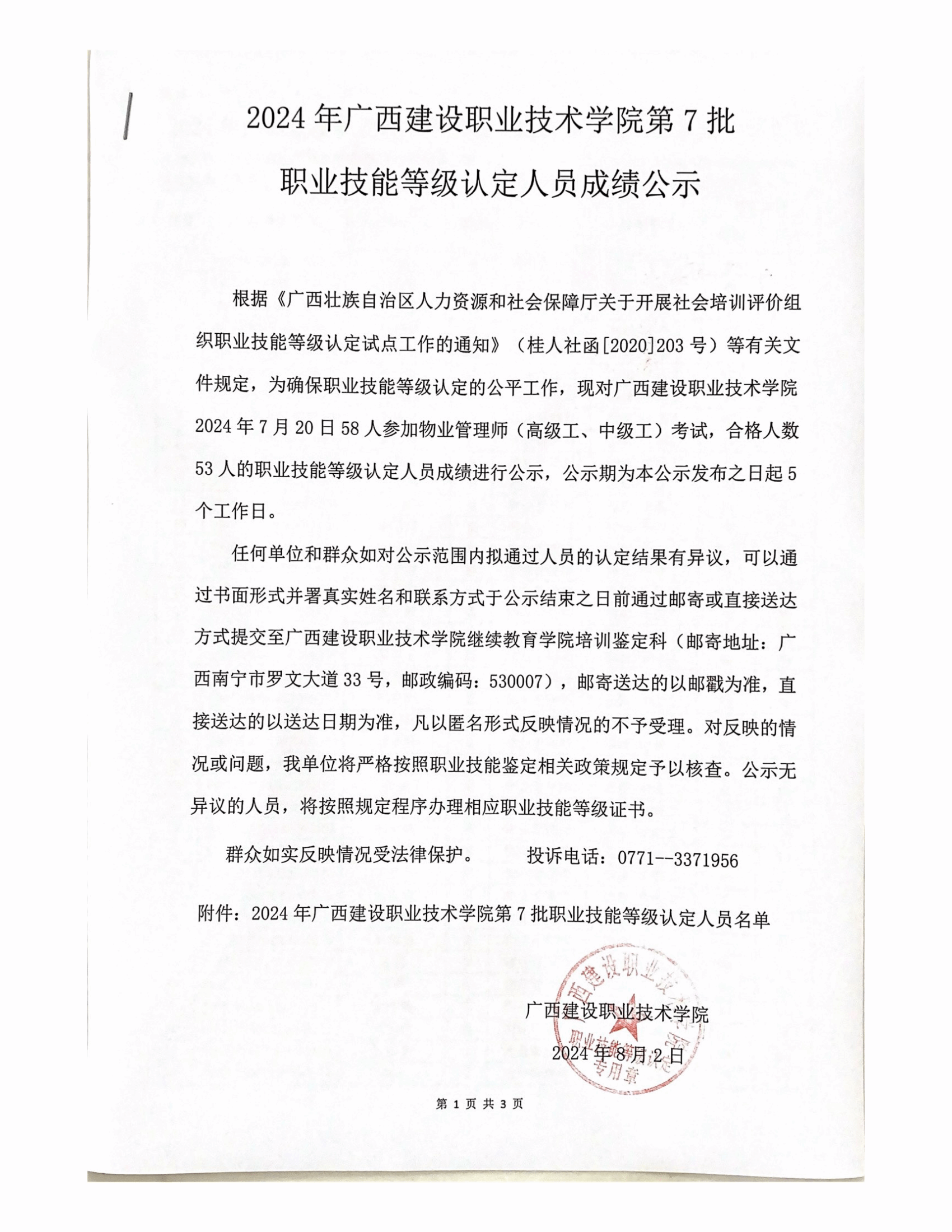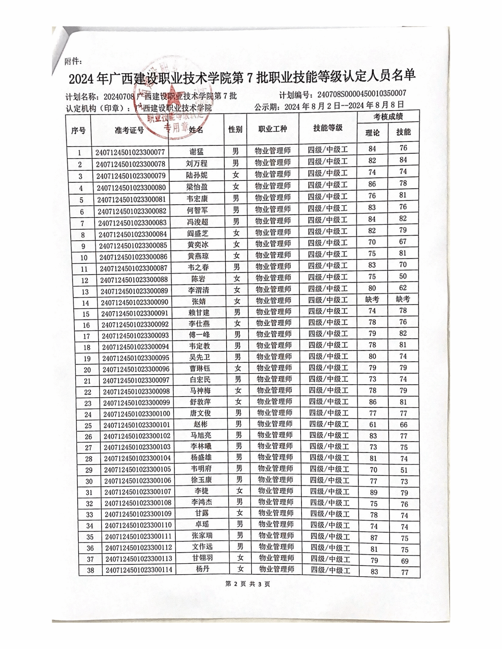 培训信息 当前位置: 首页 >> 培训信息 >> 正文 2024年雷速在线网站第7批职业技能等级认定人员成绩公示 发布日期:2024-08-03 点击: 附件【2024年雷速在线网站第7批职业技能等级认定人员成绩公示.pdf】已下载次