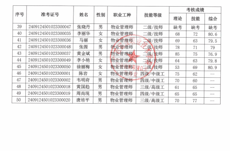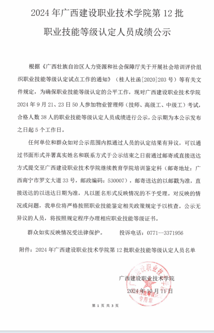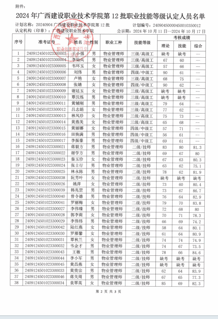 培训信息 当前位置: 首页 >> 培训信息 >> 正文 2024年雷速在线网站第12批职业技能等级认定人员成绩公示 发布日期:2024-10-11 点击: 附件【2024年雷速在线网站第12批职业技能等级认定人员成绩公示.pdf】已下载次