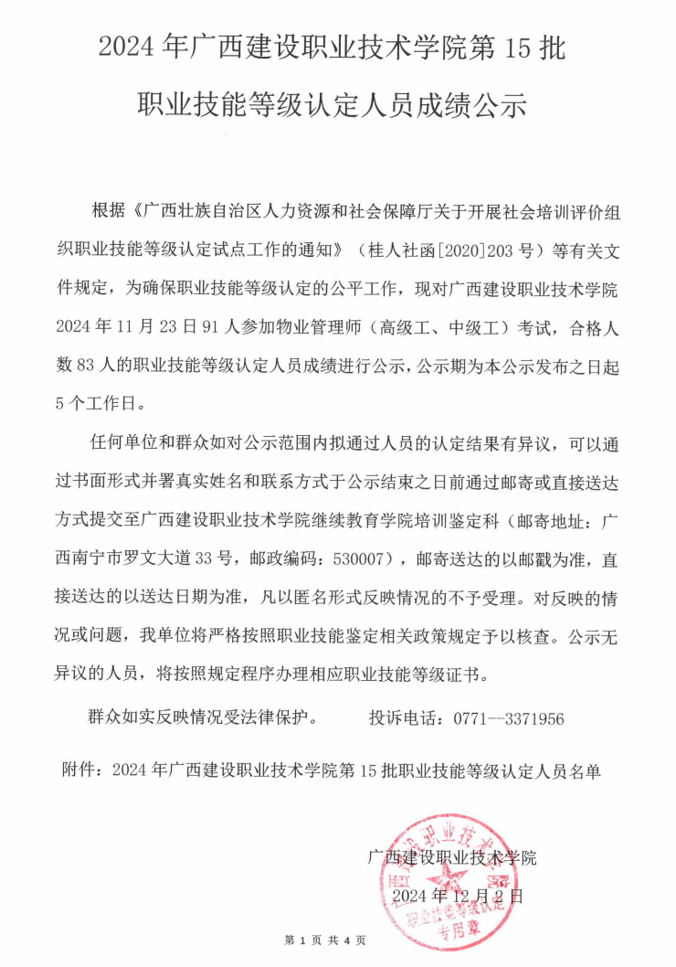 培训信息 当前位置: 首页 >> 培训信息 >> 正文 2024年雷速在线网站第15批职业技能等级认定人员成绩公示 发布日期:2024-12-03 点击: 附件【2024年雷速在线网站第15批职业技能等级认定人员成绩公示.pdf】已下载次