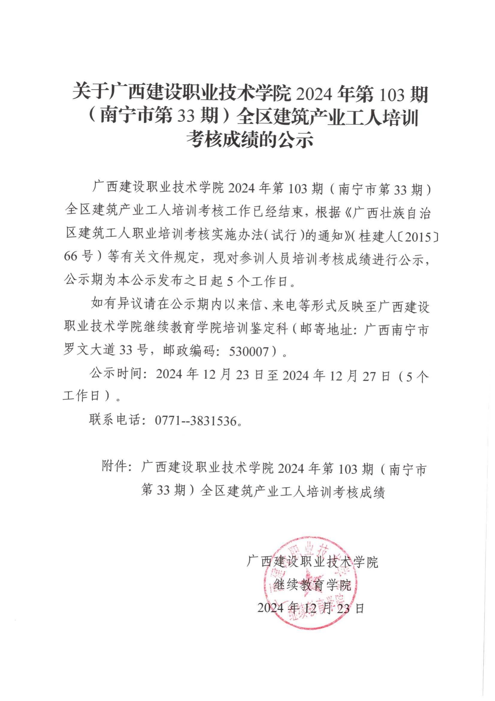 培训信息 当前位置: 首页 >> 培训信息 >> 正文 关于雷速在线网站2024年第103期(南宁市第33期)全区雷速在线网站产业工人培训考核成绩的公示 发布日期:2024-12-24 点击: 附件【关于雷速在线网站2024年第103期(南宁市第33期)全区雷速在线网站产业工人培训考核成绩的公示.pdf】已下载次