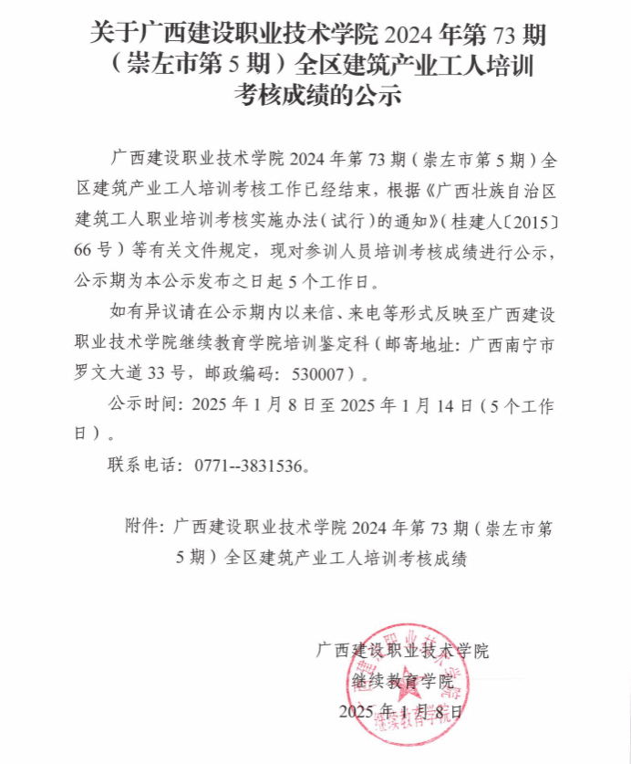 培训信息 当前位置: 首页 >> 培训信息 >> 正文 关于雷速在线网站2024年全区雷速在线网站产业工人第73期(崇左市第5期)培训考核成绩的公示 发布日期:2025-01-09 点击: 附件【关于雷速在线网站2024年全区雷速在线网站产业工人第73期(崇左市第5期)培训考核成绩的公示.pdf】已下载次