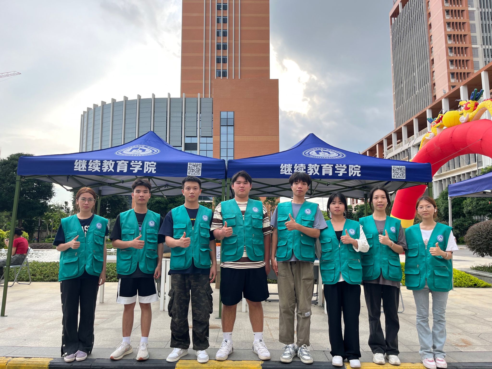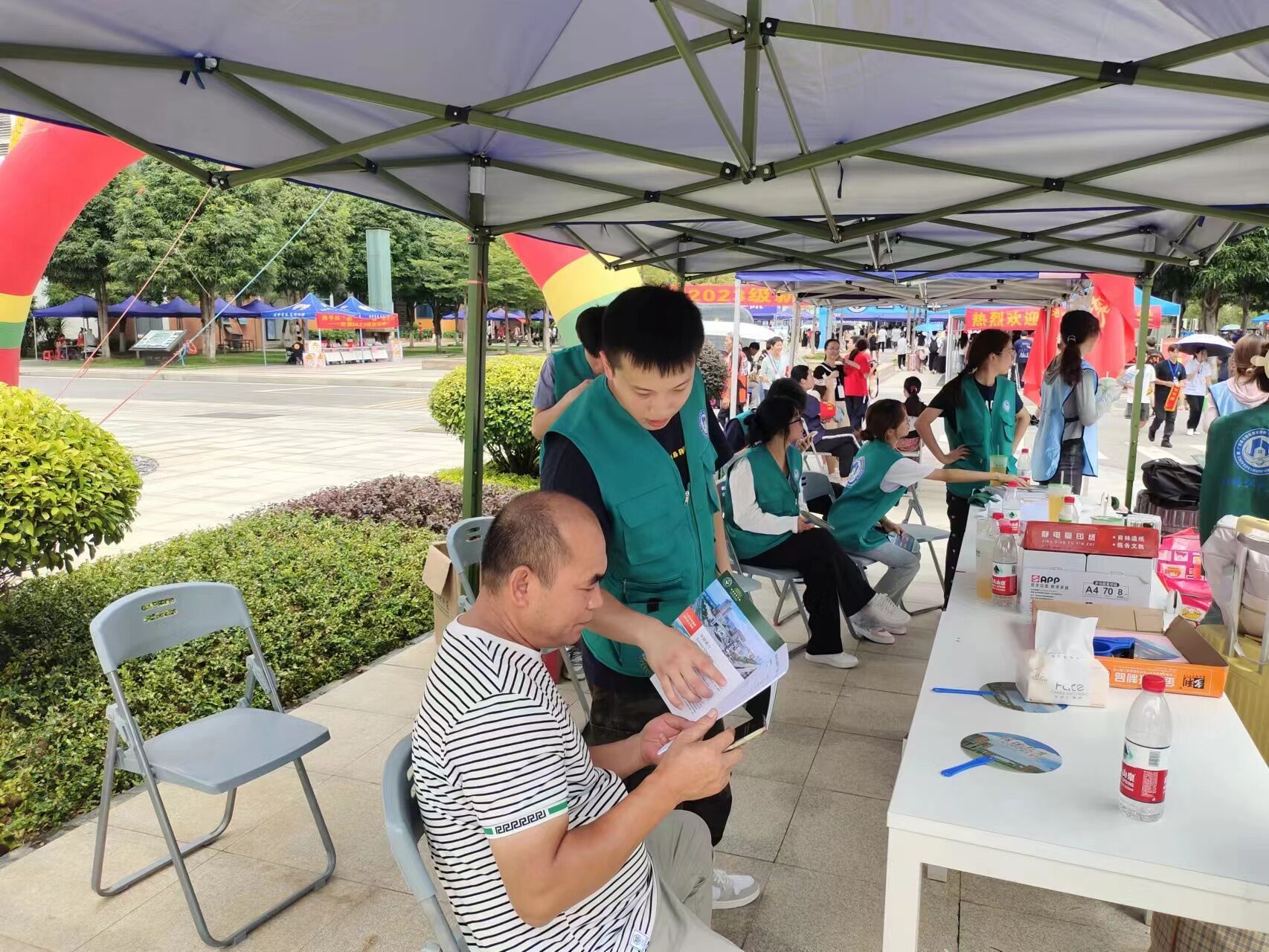 继续教育学院的宣传大棚设立在入校在校南大门入口处,热情的志愿者,丰富的培训与继续教育项目吸引了新入学的家长与学生纷纷驻足咨询与交流。志愿者向每一位来咨询的2023级新生及家长们宣传、介绍继续教育学院各类培训项目及进一步提升学历的途径。