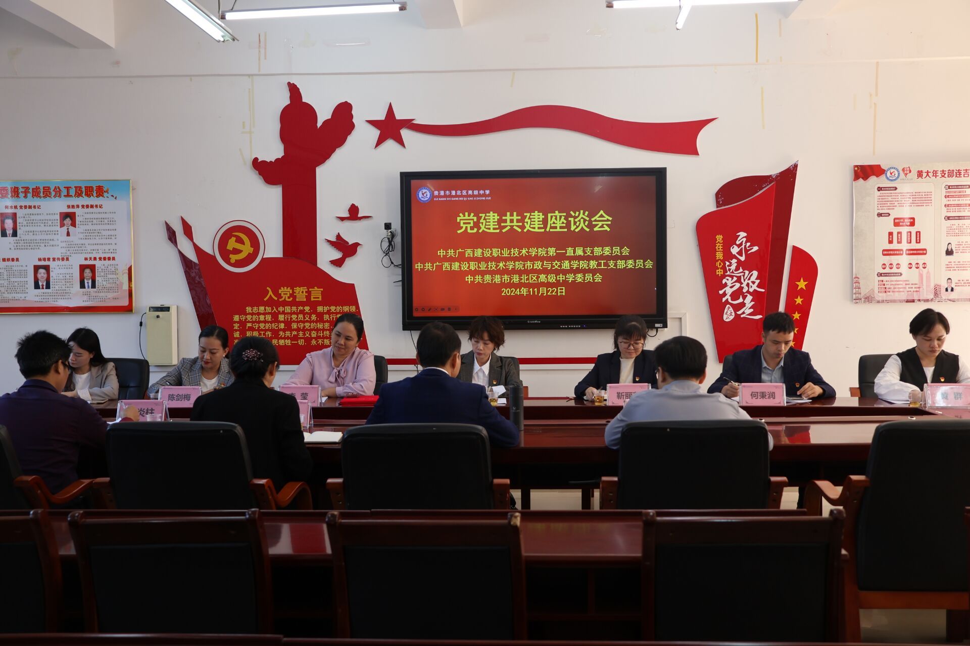 广西建院11月22日讯(继续教育学院毛娟翠)2024年11月22日,直属第一党支部副书记、继续教育学院副院长龚剑及市政与交通学院教工党支部书记、副院长靳丽莉成员代表一行7人赴黄大年的母校贵港市港北高级中学开展“弘扬爱国主义精神,凝聚干事创业力量”主题党日活动,并开展研学合作交流。