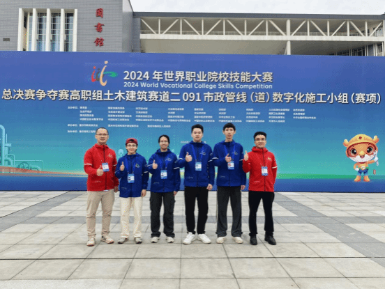 市政与交通学院10月27日讯(图/潘芳禄 文/潘芳禄 )2024年10月24至27日,由国家教育部、国家发展和改革委员会、国家科学技术部等35个部门主办的2024年世界职业院校技能大赛市政管线(道)数字化施工赛项总决赛争夺赛在重庆举办。经过激烈角逐,我院由靳丽莉副院长领队,梁志武、潘芳禄老师指导的甘宇秀、陈涛、甘雨珊、潘汉贵参赛队斩获铜奖。