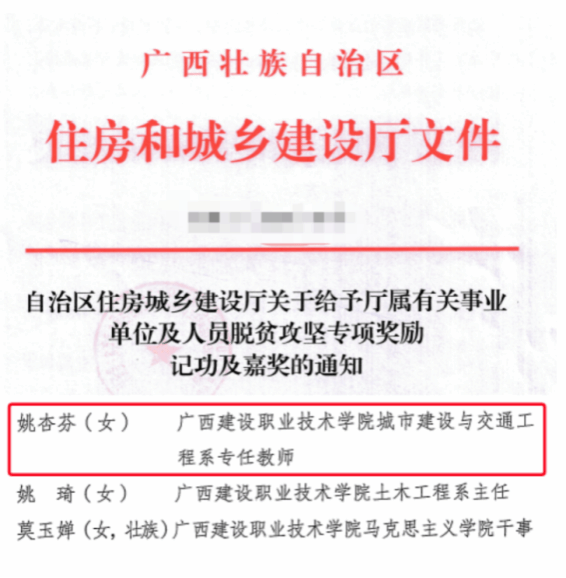 获自治区住房城乡建设厅脱贫攻坚专项奖励嘉奖