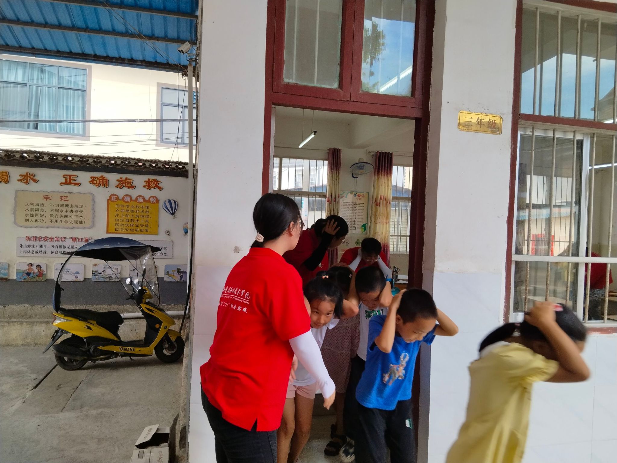 团队成员带领小学生进行防震疏散演练