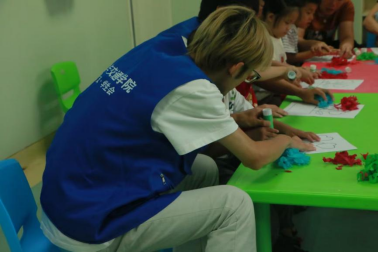 活动当天,在指导老师介绍志愿服务活动的注意事项后,志愿团前往到广西区康复中心开展活动,在康复中心工作人员的引导下进入到各个班级和小朋友们一起展开教学活动,一起玩游戏,一起看动画,一起参加剪纸及学习烹饪课程等活动。当小朋友需要帮助的时候志愿者们总会耐心的进行引导,他们以耐心为画笔,以细心为颜料,为儿童们勾勒出了一个充满爱与关怀的世界。志愿者们用行动诠释了青年学生的热情与爱心,身上磅礴的朝气也在感染着小朋友们,小朋友们发自内心的笑容就是志愿者们最好的肯定和嘉奖。