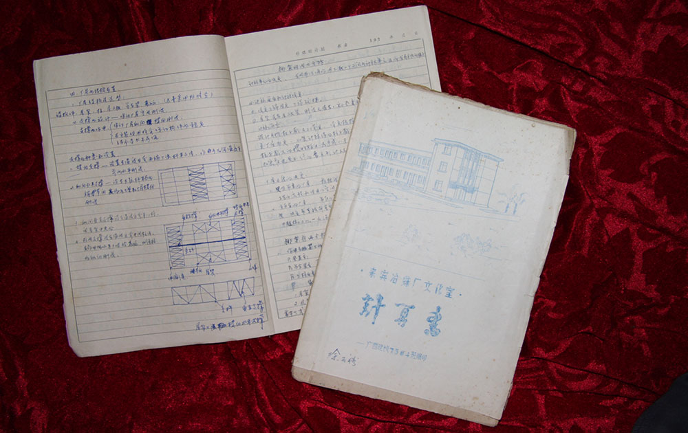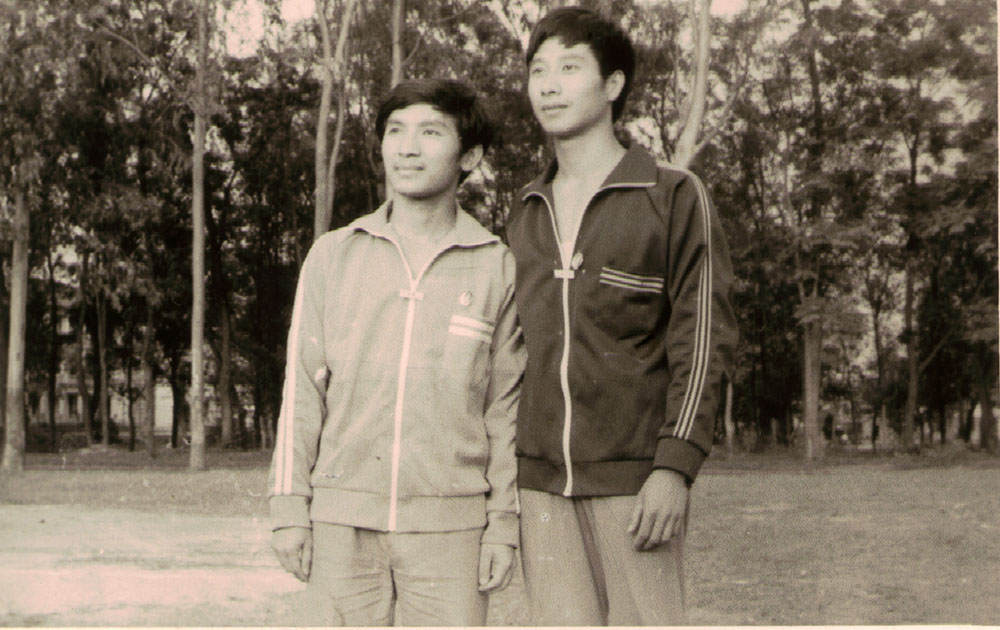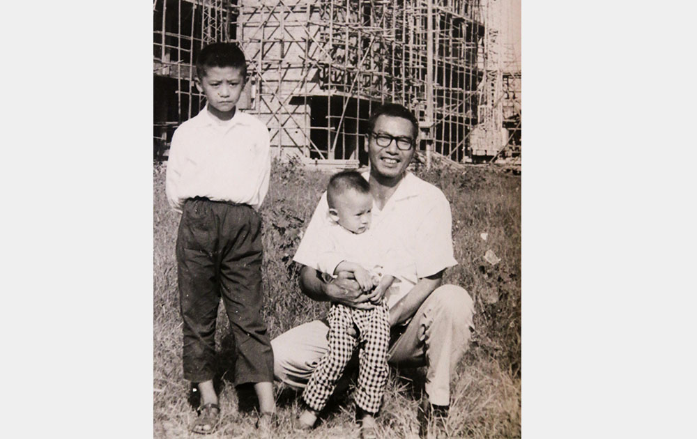 1978年许崇奭老师携两子在学校北教学楼前合影