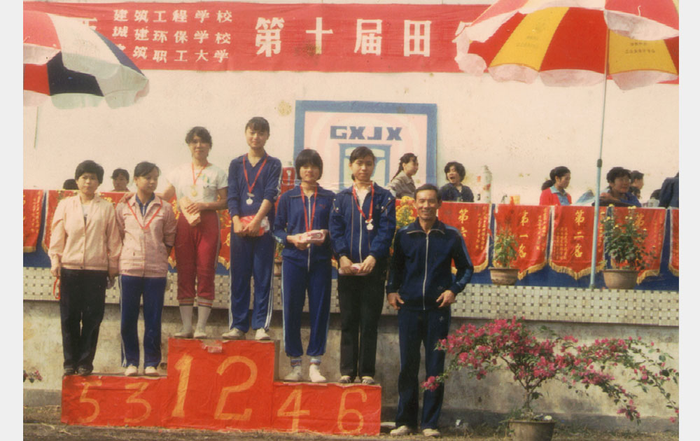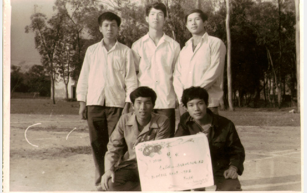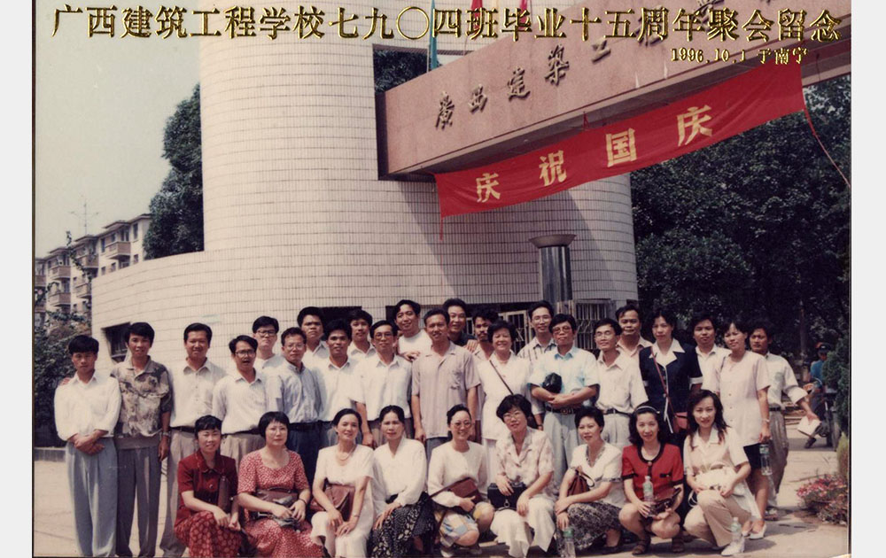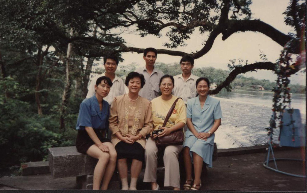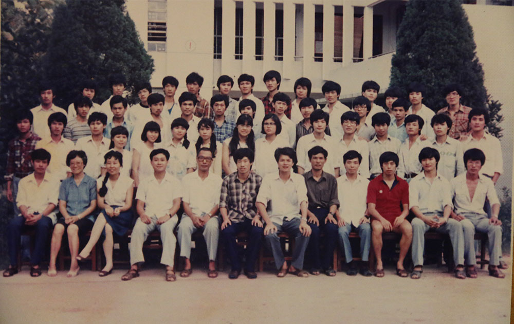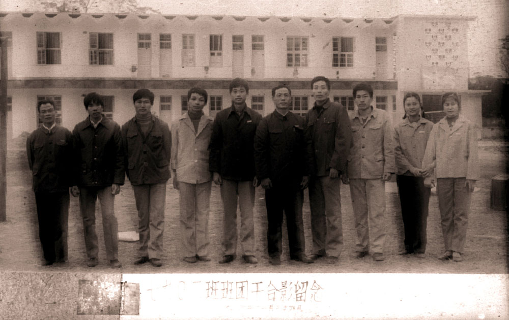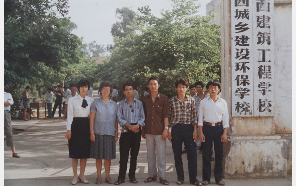 80年代鲍若玫老师(左二)与79级学生在校门前合影