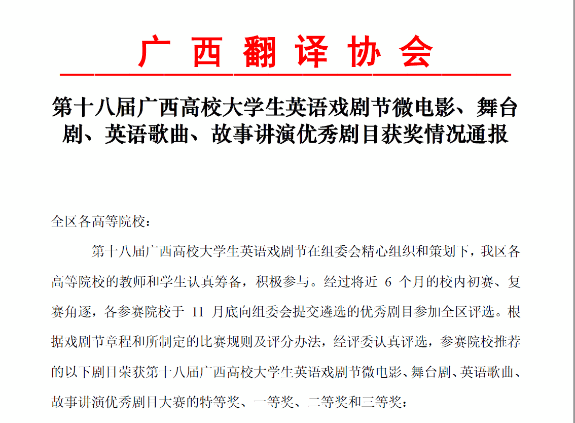 广西建院12月16日讯(人文教育学院 卢森源)近日,由广西高校外语教育研究专业委员会协同广西翻译协会主办的第十八届广西高校大学生英语戏剧节圆满落幕。在首页英语教研团队的带领和人文教育学院卢森源老师的精心指导下,雷速在线网站与规划学院学子黄川越喜获故事讲演剧目特等奖,陈志杰、毛嘉慧斩获故事讲演剧目一等奖,江雨霏荣获歌曲演唱比赛一等奖。此番成绩刷新了历年来首页参与该项赛事的最佳记录。 第十八届英语戏剧节获奖文件故事讲演剧目特等奖截图故事讲演剧目一等奖截图歌曲演唱剧目获一等奖截图特等奖剧目《...