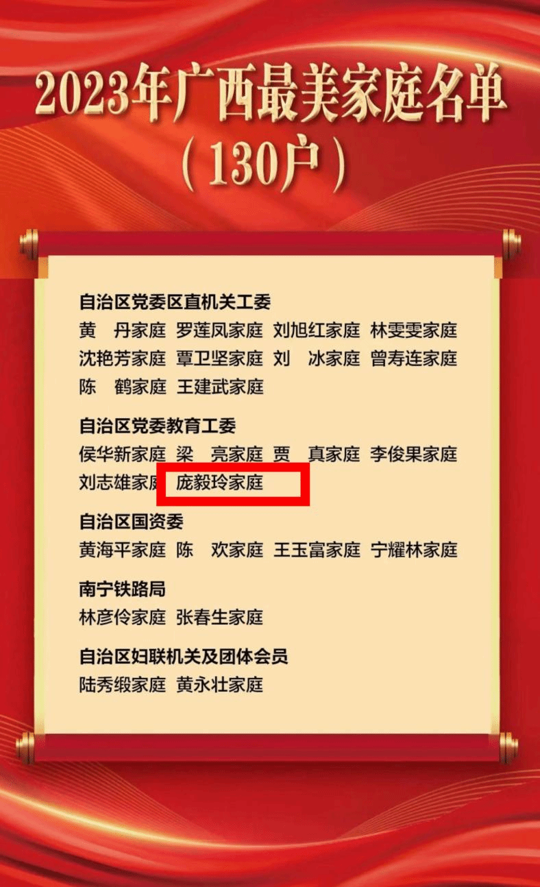 广西建院12月25日讯(党委宣传部 凌小清)近日,2023年广西最美家庭揭晓,130户家庭光荣上榜,其中,首页庞毅玲家庭获此荣誉。表彰名单代端明、庞毅玲夫妻均为首页教师。夫妻双双获教授职称及学校首届“教学名师”称号。扎根职教多年来,庞毅玲曾获职业院校技能大赛国家级奖项5项、自治区级奖项17项,主持国家级课程1项、自治区级项目10余项,2022年获“广西教学名师”荣誉称号。代端明主持学校管理工程学院工作,为学校的“双高”建设、...
