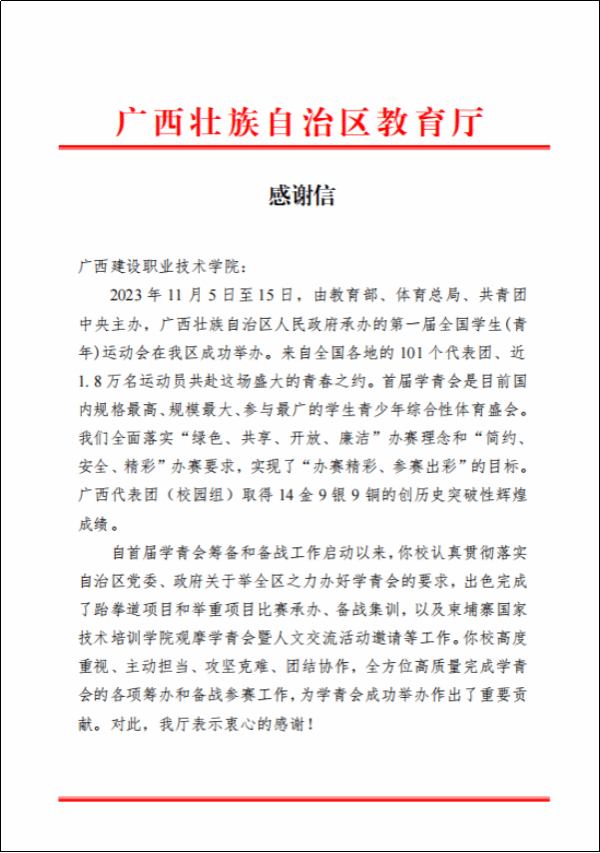 广西建院12月25日(人文教育学院 文澜)近日,自治区教育厅向首页发来感谢信,对学校在承办第一届全国学生(青年)运动会(以下简称“学青会”)跆拳道项目、举重项目赛事工作中所作出的贡献给予高度评价并表示感谢。本届学青会是广西承办的第一个竞技类全国综合性运动会,是目前国内规格最高、规模最大、参与最广的学生青少年综合性体育盛会。10月26日-11月12日期间,首页承办了学青会跆拳道、举重两个比赛项目。作为唯一一所承办两场公开组赛事的高职院校,...