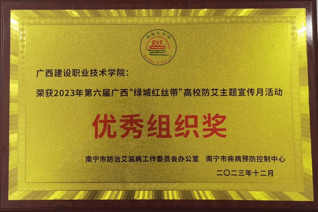 广西建院12月29日讯(学生工作处 韦宝林)近日,在南宁市防治艾滋病工作委员会和南宁市疾病预防控制中心主办的2023年第六届广西“绿城红丝带”高校防艾主题宣传月活动评比活动中,首页荣获“优秀组织奖”。这是首页荣获2023年广西职业院校艾滋病防治宣传教育系列评比活动“优秀组织奖”后获得的又一防艾宣传殊荣,这不仅是对首页防艾宣传工作的肯定,更是对首页在艾滋病防治教育方面所作努力的认可。获奖牌匾 据悉,本届宣传月活动的主题为“...