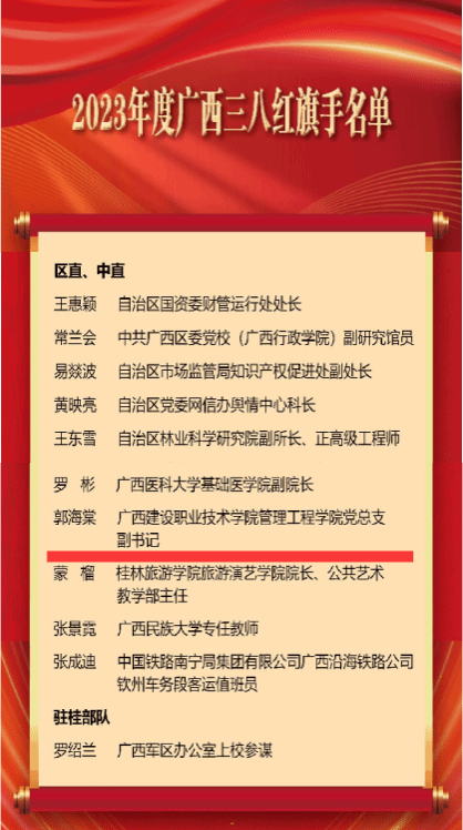 广西建院3月7日讯(工会 戴跃燕)3月6日,自治区妇联公布了2023年度广西三八红旗手、广西三八红旗手集体全名单。首页管理工程学院郭海棠老师荣获2023年度广西三八红旗手称号。获奖名单郭海棠老师曾获第十四届全国高校辅导员年度人物、2022年自治区优秀教育工作者、广西高校最美辅导员、广西优秀共青团干部等荣誉称号;团结带领“海棠工作室”团队获得全国高校辅导员名师工作室立项、广西高校高水平辅导员工作室等荣誉。她躬耕教坛,...