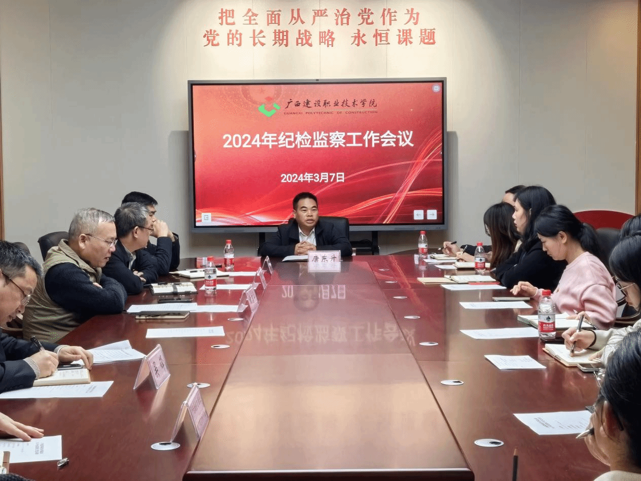 广西建院3月8日讯(纪委办公室 黄军萍)3月7日,学校纪委在学校廉洁教育中心召开2024年纪检监察工作会议。学校纪委委员,校属企业纪委书记,二级学院党总支、直属党支部纪检委员,学校及校属企业专职纪检监察干部参加了会议。会议由学校纪委委员黄启华主持。会上,与会同志观看了业务学习视频《以严的基调强化正风肃纪》《全面加强党的纪律建设 以严明政治纪律带动各项纪律全面从严》,通过视频学习,使与会同志更加清醒地认识到新时代全面从严治党面临的新形势和新任务,...