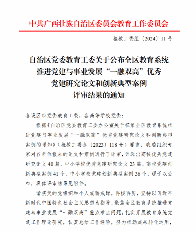 广西建院4月10日讯(马克思主义学院 曹桃) 近日,自治区党委教育工委公布了全区教育系统推进党建与事业发展“一融双高”优秀党建研究论文和创新典型案例评审结果,首页马克思主义学院教师范峥、邱岚、宋佳雄的论文《“一融双高”赋能广西高校青年党务干部队伍建设研究》荣获优秀党建研究论文一等奖。《“一融双高”赋能广西高校青年党务干部队伍建设研究》一文紧扣新时代全区高校青年党务干部队伍建设,强调“IPv6+一融双高”,依据马克思主义问题导向、...