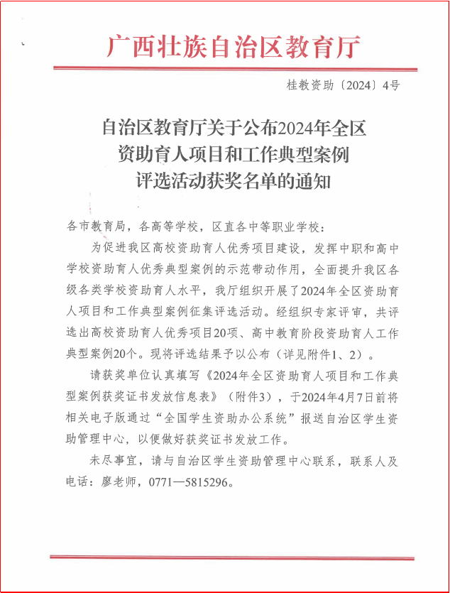 广西建院4月7日讯(党委学生工作部 欧嘉卡 杨栋)近日,自治区教育厅印发《关于公布2024年全区资助育人项目和工作典型案例评选活动获奖名单的通知》(桂教资助〔2024〕4号),在全区高校范围内共评选出资助育人优秀项目20项。首页申报的项目《家庭经济困难学生专业考证奖学金》荣获“2024年全区高校资助育人优秀项目”三等奖。文件通知“家庭经济困难学生专业考证奖学金”项目以“资助+实践”为理念,以“资助为抓手,育人为导向”的工作思路,...
