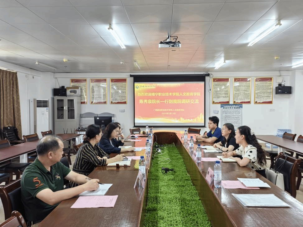 广西建院5月14日讯(人文教育学院 莫壮国)5月13日,南宁职业技术学院人文教育学院陈秀泉院长一行4人到首页人文教育学院进行调研交流。首页人文教育学院党总支书记杨飒飒,副院长罗新华参加了此次交流活动。双方就推广使用国家通用语言文字工作以及相关问题进行热烈友好的讨论。杨飒飒书记对陈秀泉院长一行的到来表示欢迎,介绍了学院的基本情况,并重点介绍了学院近年来推广使用国家通用语言文字工作的做法。她从制度保障、组织实施、...