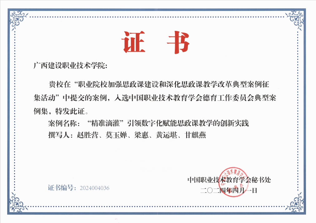 广西建院5月18日讯(马克思主义学院 莫玉婵)近日,中国职业技术教育学会公布了职业院校加强思政课建设和深化思政课教学改革典型案例征集活动评选结果。首页思政课教学改革案例《“精准滴灌”引领数字化赋能思政课教学的创新》入选中国职业技术教育学会德育工作委员会典型案例集。近年来,首页始终坚持以习近平新时代中国特色社会主义思想为指导,贯彻习近平总书记对学校思政课建设作出的重要指示精神,落实立德树人根本任务,在思政课教学改革方面取得了显著成效。...