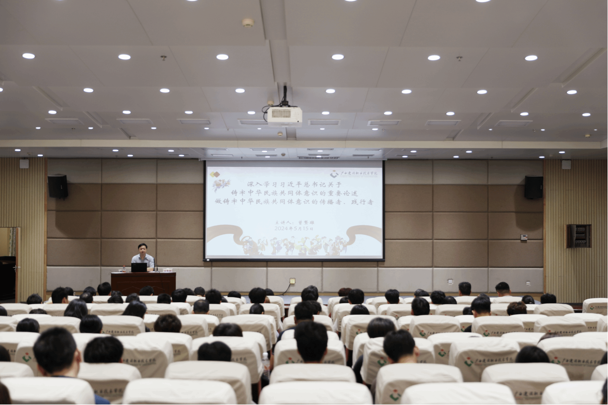 广西建院5月16日讯(文/党委组织部 张玉燕 图/党委宣传部 韦植巍)为深入贯彻落实习近平总书记关于加强和改进民族工作的重要思想,紧紧围绕铸牢中华民族共同体意识工作主线,坚定把握团结奋斗的时代要求,5月15日上午,首页举办铸牢中华民族共同体意识专题报告会,学校党委副书记曾繁雄作专题报告。报告会现场曾繁雄副书记以《深入学习习近平总书记关于铸牢中华民族共同体意识的重要论述 做铸牢中华民族共同体意识的传播者、践行者》...