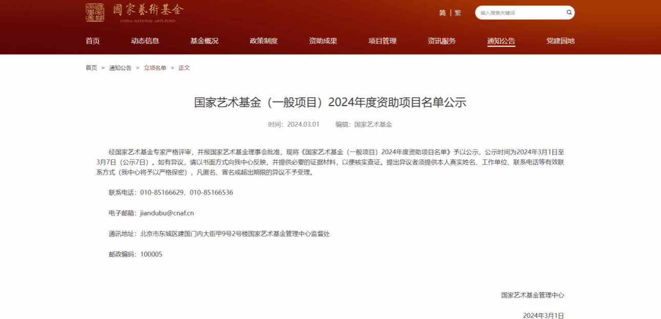 广西建院5月24日讯(艺术设计学院 高翔)近日,国家艺术基金管理中心公示了国家艺术基金(一般项目)2024年度资助项目名单,首页艺术设计学院覃石胜老师入选青年艺术创作人才资助项目。这是此次资助项目评审全区高职高专入选的唯一作品,也是首页获得的首个国家艺术基金资助项目。国家艺术基金与国家自然科学基金、国家社会科学基金并称为“国家三大基金”,是旨在繁荣艺术创作、打造和推广精品力作、培养艺术人才、推进国家艺术事业健康发展的公益性基金,...