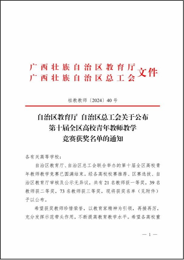广西建院6月25日讯(教师发展中心 张望)近日,由自治区教育厅、自治区总工会联合举办的第十届全区高校青年教师教学竞赛在广西师范大学圆满落下帷幕。来自全区75所高校259名教师参加初赛,58所高校的134名教师晋级决赛。经过激烈角逐,首页马克思主义学院教师万秀熠荣获思政组一等奖、人文教育学院教师林怡荣获理科组一等奖、市政与交通学院教师宋柳荣获工科组二等奖。学校高度重视此次比赛,教师发展中心、工会等部门精心组织与配合,...