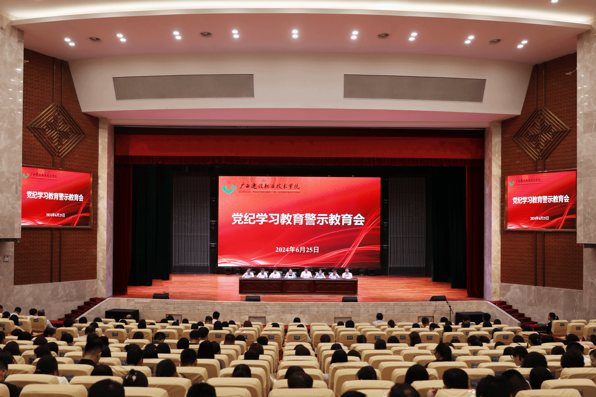 广西6月26日讯(文/纪委办公室 李雪萍 图/党委宣传部 韦植巍 记者团 李承宏)为深入学习贯彻习近平总书记关于全面加强党的纪律建设的重要论述,认真落实党中央和自治区党委关于党纪学习教育的部署要求,6月25日,党纪学习教育警示教育会在学校礼堂召开。学校领导班子成员,党委委员,纪委委员,各二级学院党政领导班子成员、各职能部门正副职负责人,校属企业班子成员,教职工党员、离退休党员参加了会议。会上,与会人员集体观看了由自治区纪委监委制作的党纪学习教育警示教育系列专题片《...