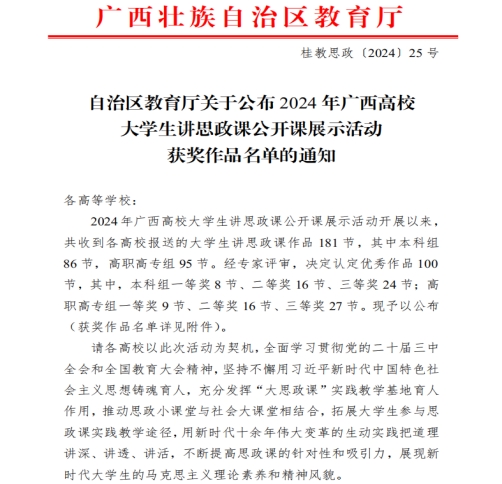 广西建院11月28日讯(马克思主义学院 宋佳雄)近日,自治区教育厅公布了2024年广西高校大学生讲思政课公开课展示活动获奖名单。首页马克思主义学院思政课教师蒙文艳、潘柳虹团队参评的作品《以我之青春描绘壮美之乡村》,李倩老师团队参评的作品《如何提高人民军队打赢能力—朝着实现党在新时代的强军目标奋勇前进》均荣获高职高专组一等奖。据悉,此次评选活动是全面学习贯彻党的二十届三中全会和全国教育大会精神,坚持不懈用习近平新时代中国特色社会主义思想铸魂育人的重要举措。...