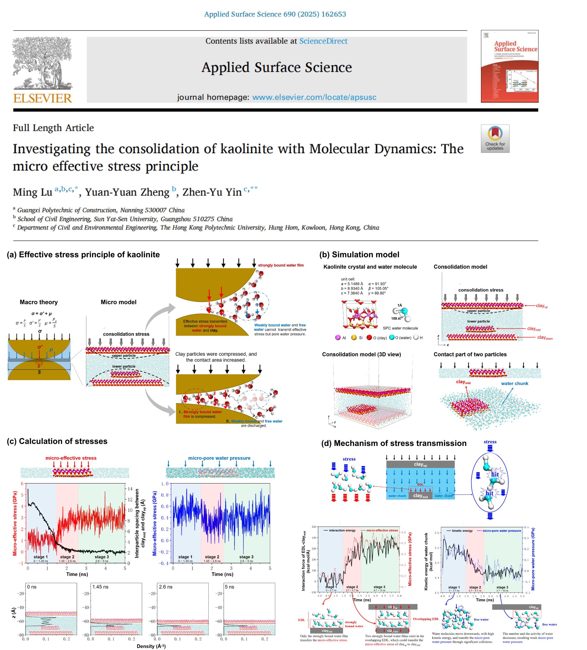 广西建院5月8日讯(文/土木工程学院 陈思羽 科研中心 陶敏华 图/陆明)近日,首页土木工程学院陆明博士在纳米土力学方向取得突破性进展,于2024年6月、2025年2月及5月分别在国际学术期刊《Applied Surface Science》和《Computers and Geotechnics》连发3篇纳米土力学系列高水平学术论文。陆明博士多年来致力于微观土力学研究,主要运用分子动力学方法探索纳米尺度岩土材料的各种力学响应和化学反应,从而实现从微观到宏观土力学理论的搭建和完善,...