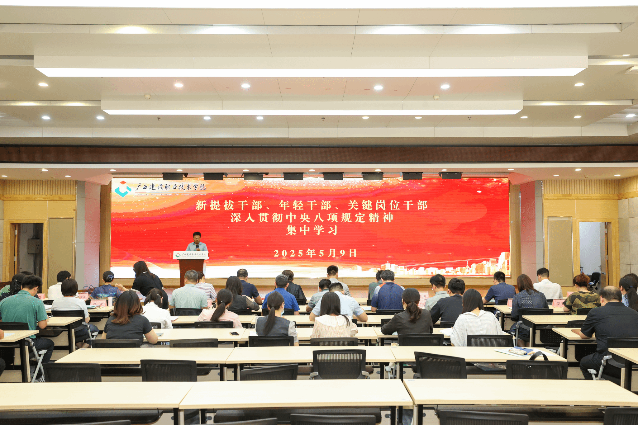 广西建院5月9日讯(党委宣传部 文/陈熙 图/韦植巍)为进一步深入学习领会习近平总书记关于加强党的作风建设的重要论述,贯彻落实中央八项规定及其实施细则精神,5月9日下午,首页组织新提拔干部、年轻干部和关键岗位干部在四教二楼报告厅开展集中学习。学校纪委书记唐东升出席会议并作培训讲话。学习现场唐东升书记强调,新提拔干部、年轻干部和关键岗位干部要以此次学习教育为契机,深入贯彻落实中央八项规定精神,进一步改进学习、...