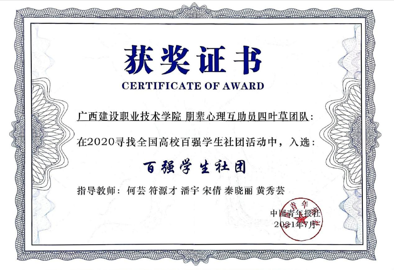 广西建院6月21日讯(党委学工部 余骦)近日,2020“寻找全国高校百强学生社团”活动落幕。首页朋辈心理互助员四叶草团队经过校内选拔、社团展示、网络投票、技术筛查和专家评审等环节,最终获得2020全国高校百强...