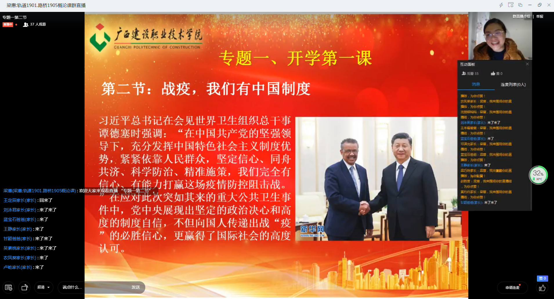 广西建院3月10日讯(马克思主义学院 蓝莹)3月9日下午,教育部社会科学司、人民网联合举办了“全国大学生同上一堂疫情防控思政大课”,首页高度重视,共组织一万八千余名在校生及全体思政课教师、学管教师齐聚“云端...