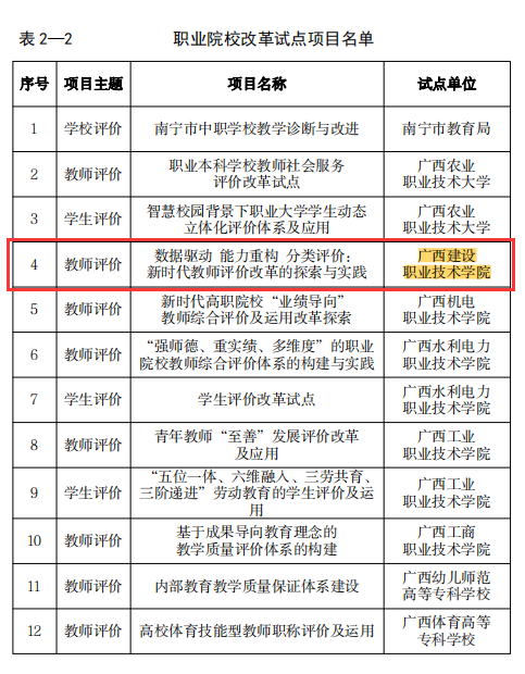 广西建院4月21日讯(质量管理办公室 覃珊珊)近日,自治区党委教育工作领导小组办公室印发了《关于公布广西深化新时代教育评价改革第一批试点项目名单的通知》(桂党教办〔2022〕15号),首页“数据驱动 能力重...