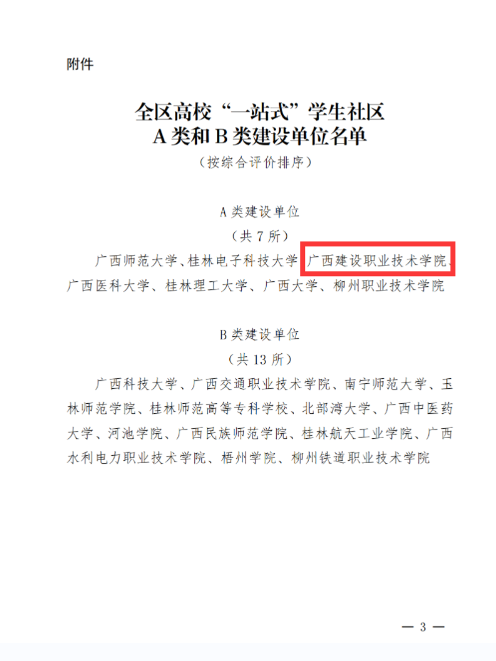 广西建院10月28日讯(党委学生工作部 宋霞)10月25日,广西教育厅公布第一批全区高校“一站式”学生社区建设A类和B类单位名单,首页以全区高校第三、高职高专第一的综合评价排名,获评A类建设单位。本次认定工作...