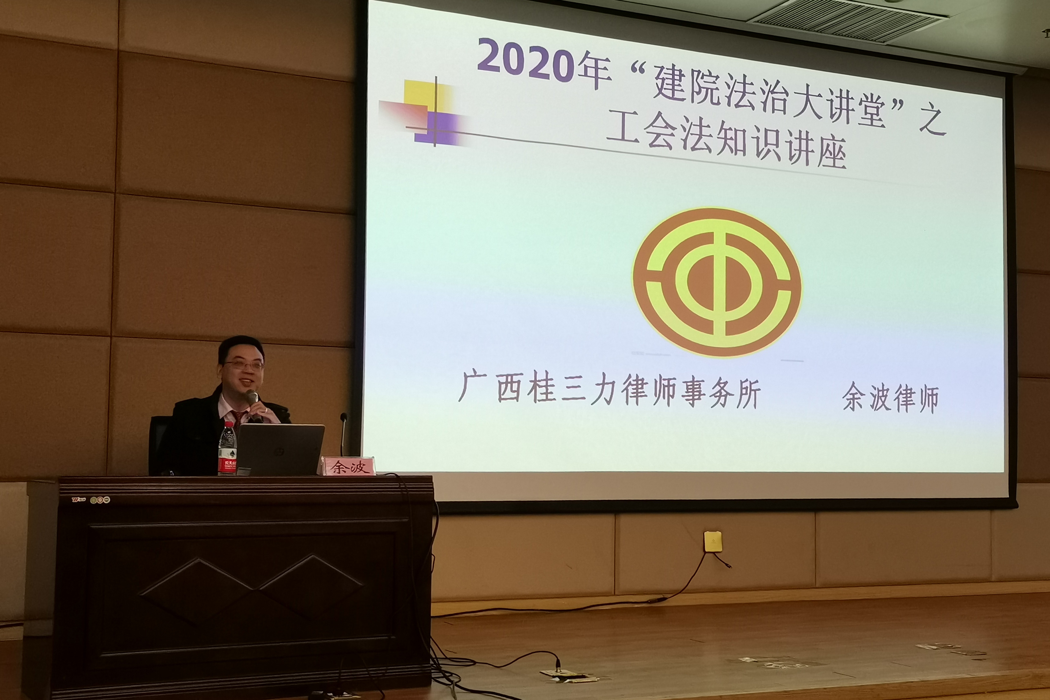 广西建院12月23日讯(工会 梁韵)为进一步维护首页工会会员的合法权益,提高会员知法、懂法、用法意识,首页工会于12月23日下午在四号教学楼报告厅开展了“工会法”知识讲座,邀请广西桂三力律师事务所合伙人、法律顾...