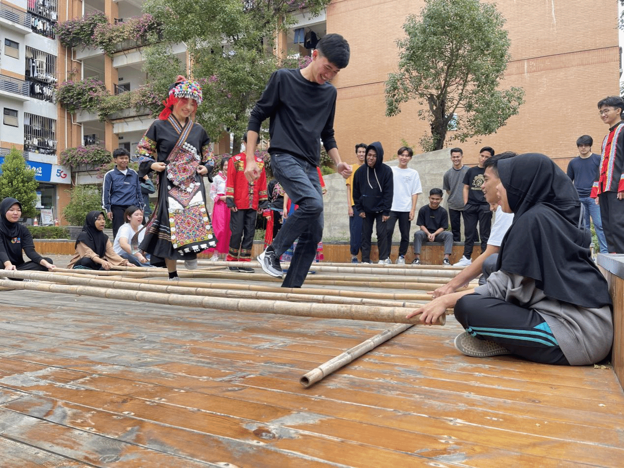 广西建院12月13日讯(市政与交通学院 文/高杨杨 李姿蓉 图/黄恩晨 韦华宁)为进一步丰富首页留学生校园生活,广泛传播中华优秀传统文化,12月12日下午,知行工作室成员高杨杨、梁金来、黄华以及艺术学院高翔老师组织首页21名国外留学生,与市政学院学生代表一同在学生社区建身吧开展了一场别开生面的民俗传统活动——竹竿舞。时逢腊月,冬日的校园依旧温暖如春,30余名同学们穿上属于自己民族的服装,与老师们一起来到健身吧广场。梁金来老师向同学们介绍了竹竿舞的文化,...