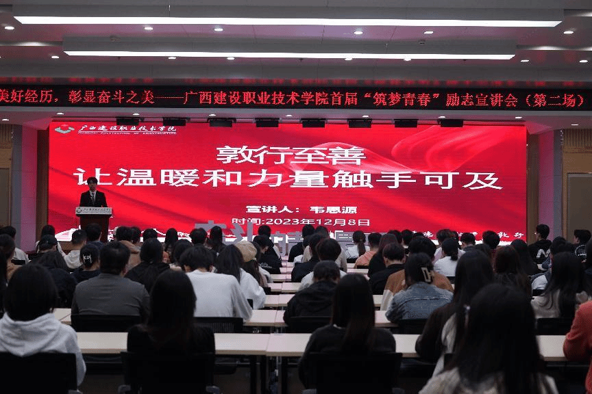 广西建院12月9日讯(土木工程学院 文/冯光帆 图/杨凯文)为讲好奋斗故事,培养奋斗精神,助推优良校风学风形成,让奋斗之美深入学业、汇入生活、融入文化、渗入人心,12月8日,由党委学生工作部主办、扬帆工作室承办的首届“筑梦青春”励志宣讲会(第二场)在四教二楼报告厅举行。本场宣讲会由扬帆工作室主持人冯光帆老师主持,来自7个二级学院的200余名家庭经济困难生到场聆听学习。宣讲过程中,土木工程学院建工2113班于谋康以《坚定信仰,...