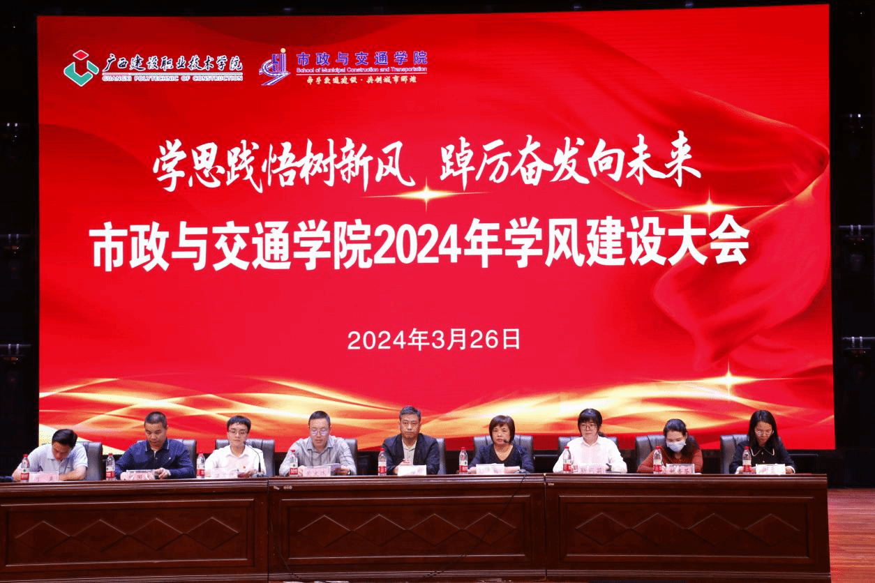 广西建院3月28日讯(市政与交通学院 文/刘雪妮 图/许大谦)为进一步加强市政与交通学院的学风建设,营造“比学赶帮超”的学习氛围,助力大学生成长成才,市政与交通学院于3月26日下午在学校礼堂举办了“学思践悟树新风 踔厉奋发向未来”——2024年学风建设大会。市政与交通学院全体党政领导、全体辅导员、专职教师,全体在校学生参加会议。会议由院长助理潘芳禄主持。会上,党总支书记刘海彬作2023年学生工作总结。他在讲话中全面总结了2023年学院取得的一系列优异成绩,...