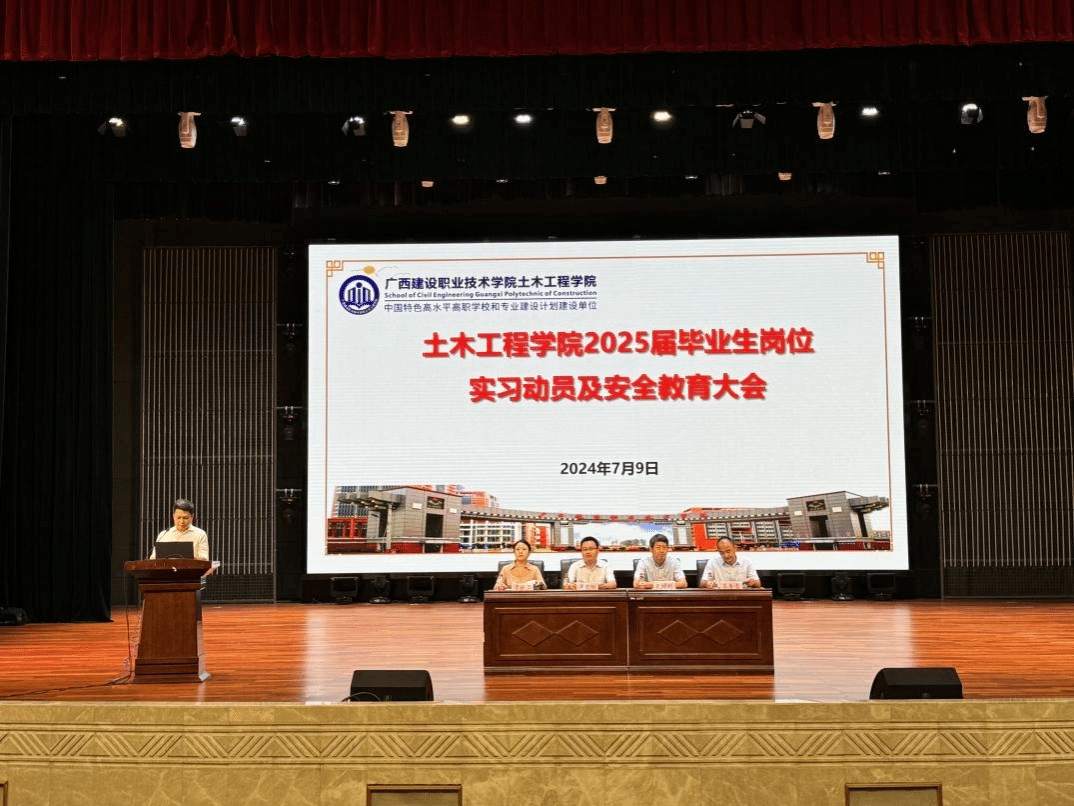 广西建院7月10日讯(土木工程学院讯 文/石明成 图/韦景朝 何可人)为进一步加强毕业岗位实习过程管理和安全教育,明确岗位实习要求,7月9日,土木工程学院在学校礼堂分批次召开2025届毕业生岗位实习动员及安全教育大会。土木工程学院院长李朝阳,党总支书记孔祥刚,副院长葛春雷、罗献燕等学院领导出席,实习老师代表、2025届毕业生辅导员及毕业生参加大会。大会由吴国堃老师主持。会上,罗献燕副院长从毕业实习指导老师安排,毕业实习期间注意事项,...